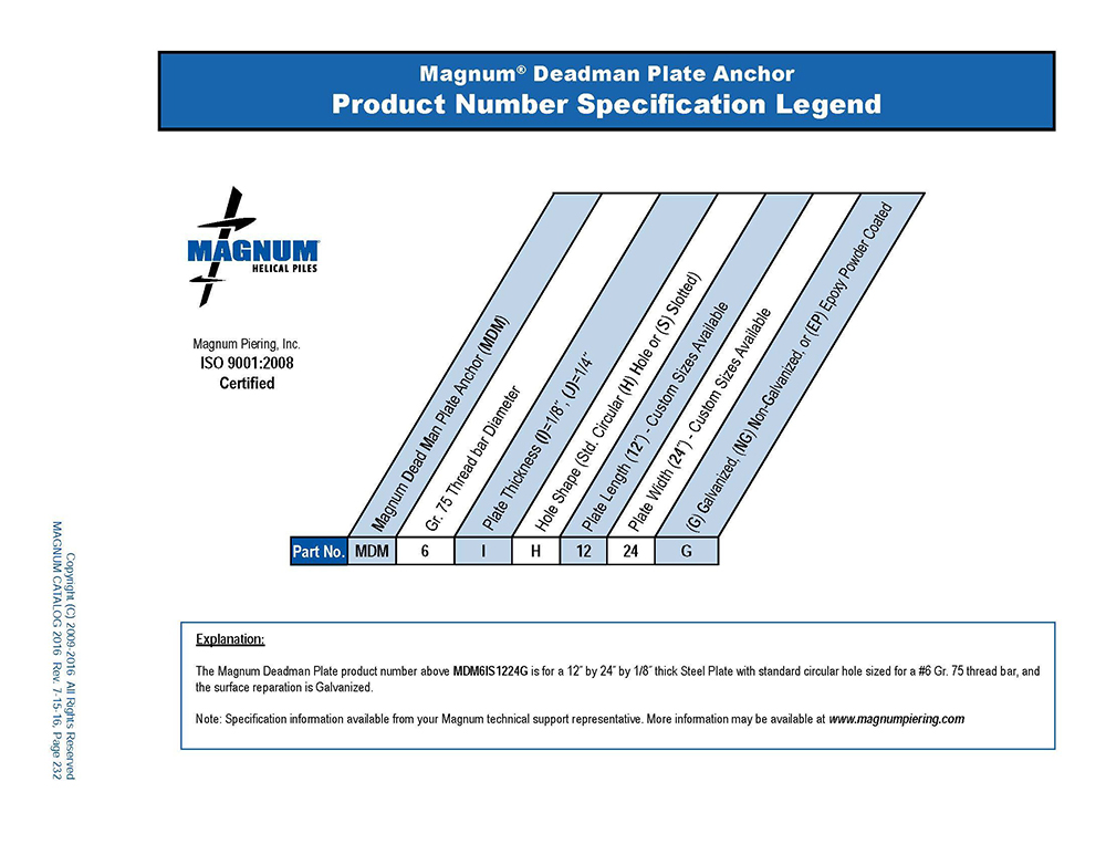 Deadman Plate Achor Product No. Specification Legend which describes how to read product numbers