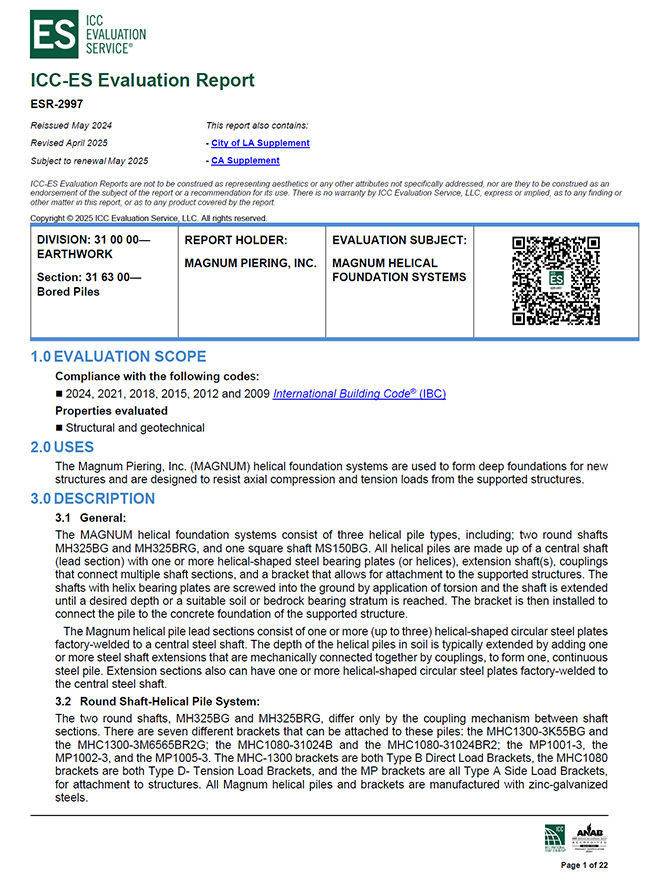 ESR-2997 MAGNUM Helical Foundation Systems