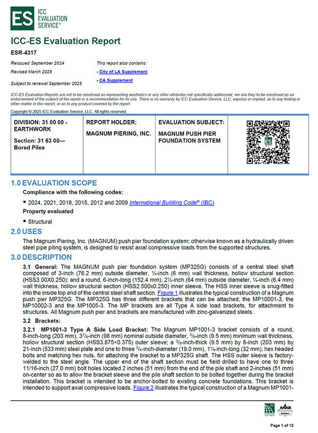 / ESR-4317 MAGNUM Push Pier Foundation System