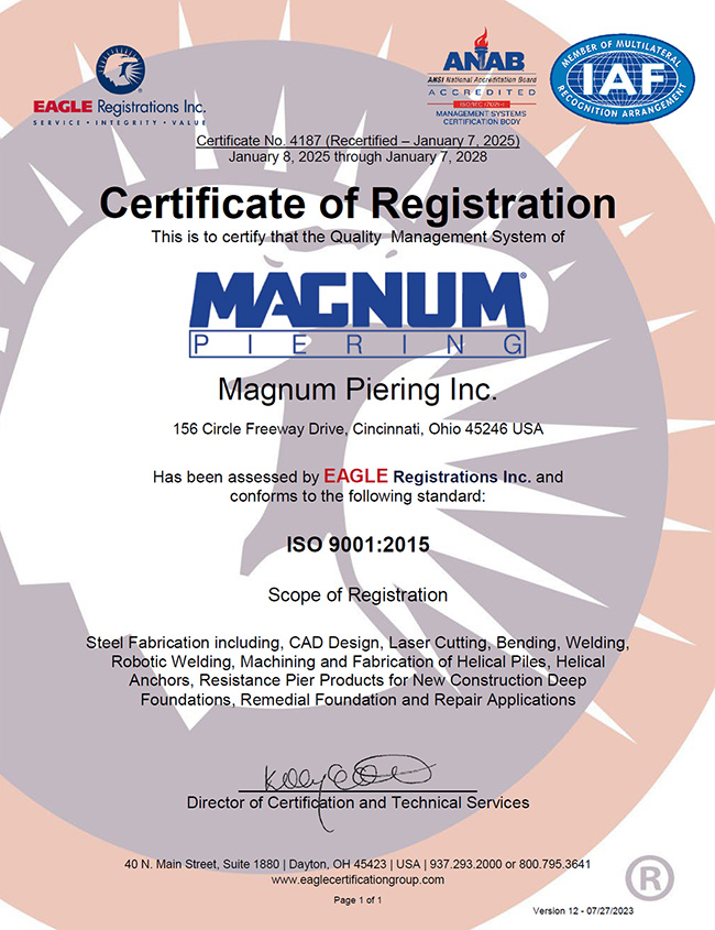ISO 9001:2015 Scope of Registration Steel Fabrication including, CAD Design, Laser Cutting, Bending, Welding, Robotic Welding, Machining and Fabrication of Helical Piles, Helical Anchors, Resistance Pier Products for New Construction Deep Foundations, Remedial Foundation and Repair Applications