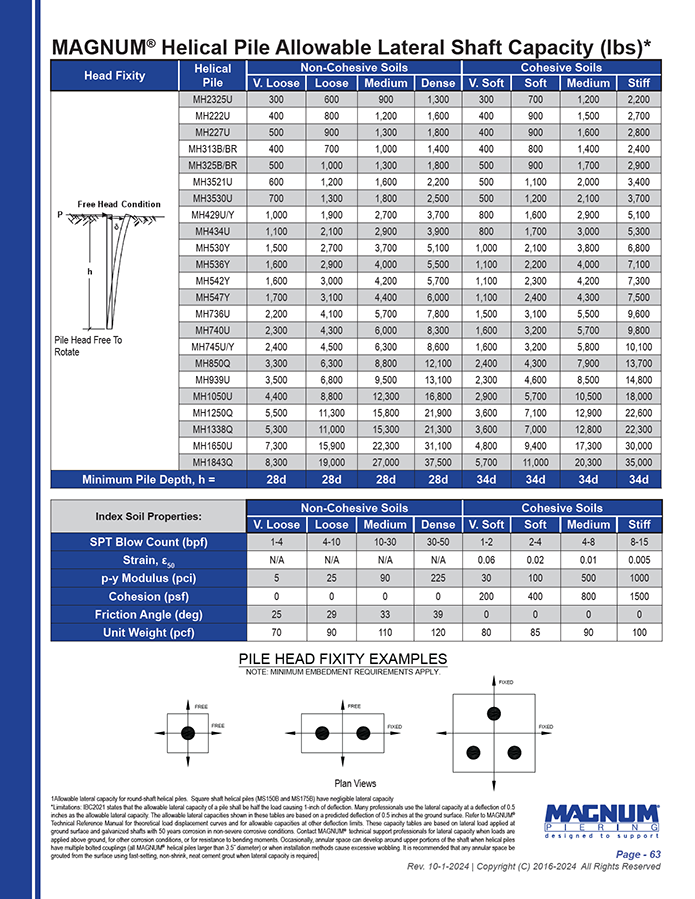 Table that shows the allowable lateral shaft capacity in non-cohesive and cohesive soils. Referenced for MAGNUM® piles in their free head condition. Cart is organized by pile name and shaft diameter. General Listing of Helical Piles