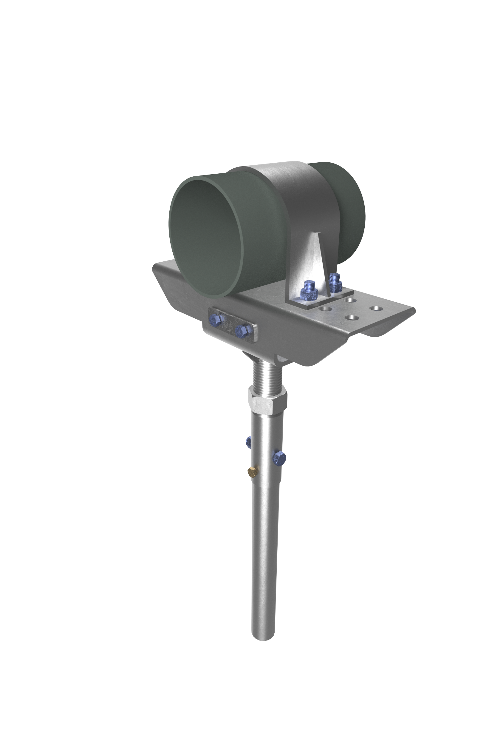 MHC1092-3BR1 Pipe Support Caps (steel cap) consist of a collar tube with a bolt hole for connection to MAGNUM® helical piles and an adapter plate secured to a large diameter threaded bar that allows up to 3” of elevation adjustability and +/-2” of lateral adjustability. The unique design of this cap allows it to be used in pipe support applications where lateral loads will be applied to the top of the pile head, which generally cause bending that can only be resisted by the strength of the large threaded bar. MAGNUM® products are manufactured in the USA according to our ISO 9001 approved quality program. Structural capacities are developed according to AISC 360 considering an average design life of 75 years for spray galvanized steel in most soil conditions. Design and detailing of the piping system to which pipe support caps are attached varies by project and is the responsibility of the registered design professional.