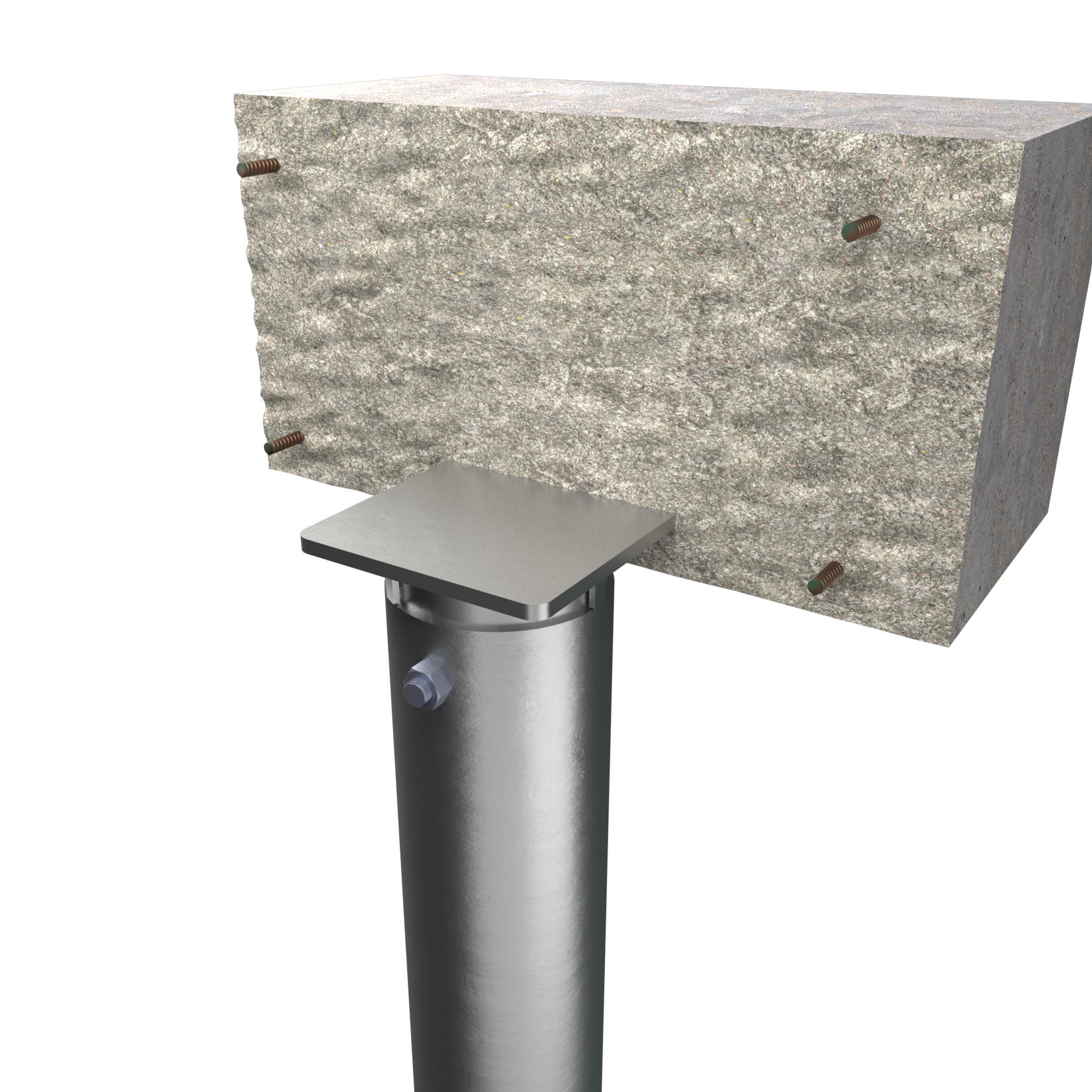 MHC1300-13O1414B1 bearing plate cap has 199 tons ultimate capacity, 99.5 tons allowable capacity in compression. 70 tons ultimate capacity, 35 tons allowable capacity in tension. The bearing plate cap consists of a collar tube with bolt hole for connection to Magnum helical piles. It includes a 16” x 16” x 7/8” plate for embedment in cast-in-place reinforced concrete. The bearing plate cap is designed in accordance with ICC-ES document AC358 as well as IBC, ACI, and AISC codes. Application of the cap varies by project and is the responsibility of registered design professional including minimum embedment for two-way and one-way punching shear, reinforcement of concrete, and pile spacing.