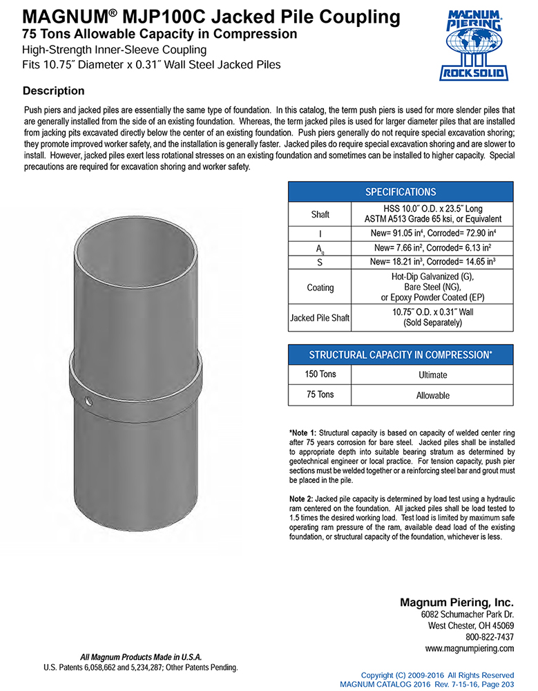 MJP100C Jacked Pile Coupling cut sheet with a description of the product, specifications, capacity, and installation information.