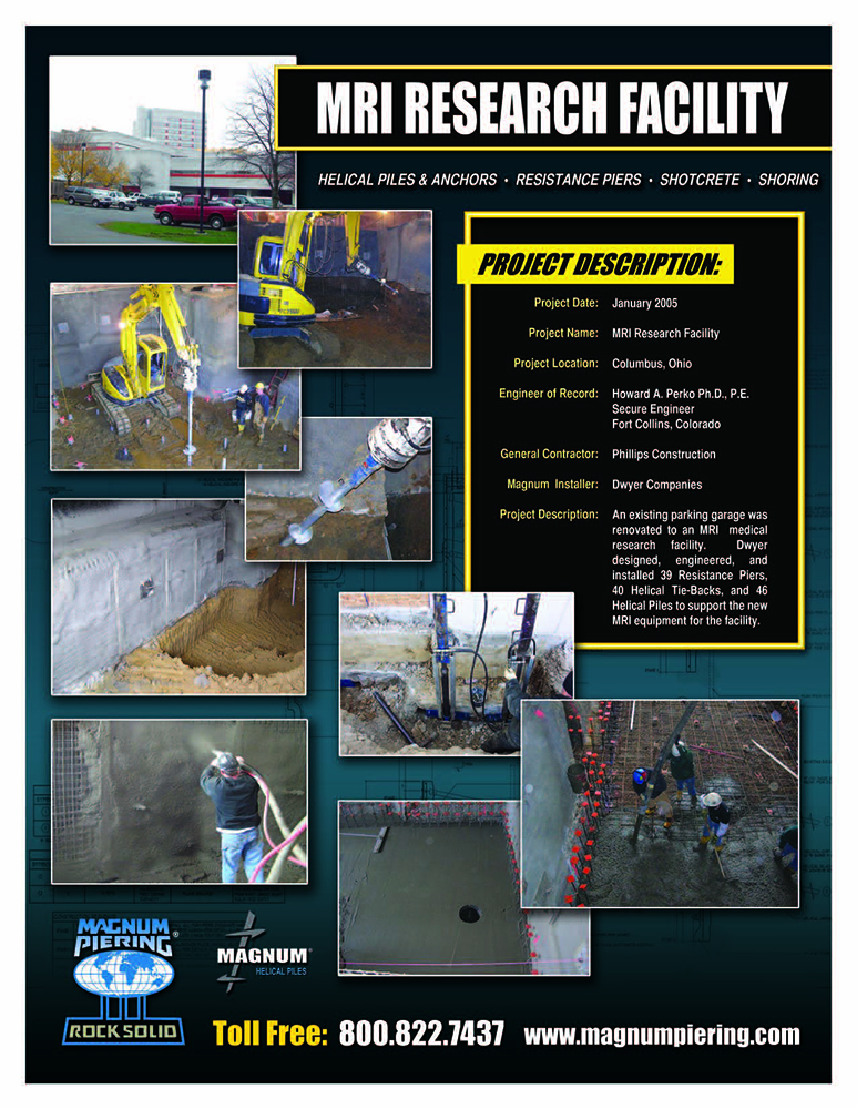 The Design Professional, Engineer of Record, or Installation Contractor should use this information after some due diligence and edit and supplement them to suit any specific purpose. Design Professionals, Engineers, and Installation Contractors are encouraged to contact Magnum Piering and Magnum Geo-Solutions with any questions about the example case histories or to seek assistance with Magnum product selection and specification.
