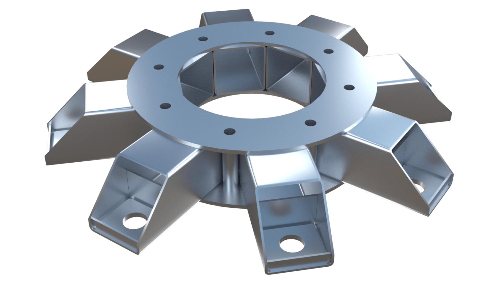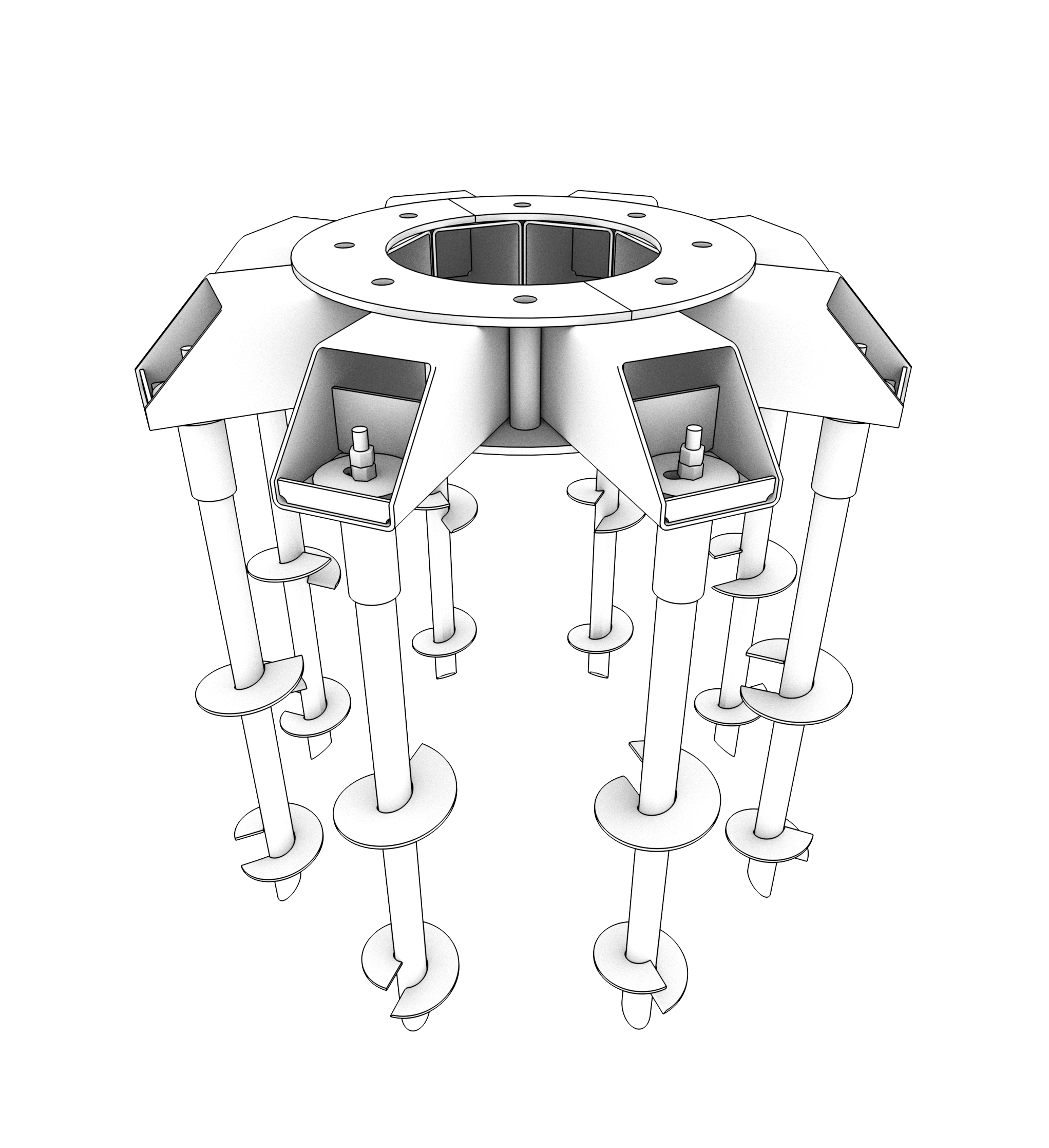 MUG208-7 Utility Grillage (MUG) has a factored groundline moment capacity of 1,500 kip-ft. MUGs are made to order for the Power Transmission Industry following our ISO 9001 certified quality program. Grillage central mounting plates are configured to coordinate with project specific pole base plates. The grillage beams span to a symmetric pile group. Patented clamp-style caps allow MAGNUM® helical piles to directly support the MUG providing an all-steel foundation solution for remote or demanding site locations.