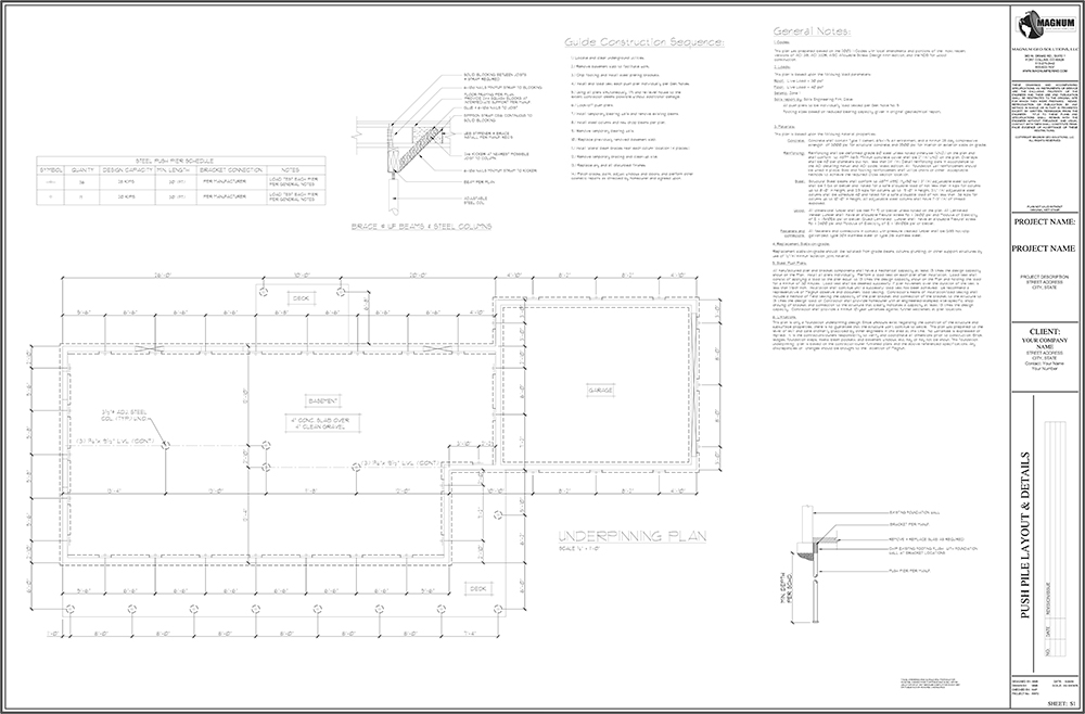 The Design Professional or Engineer of Record should use this information after some due diligence and edit and supplement them to suit any specific purpose. Design Professionals and Engineers are encouraged to contact Magnum Piering and Magnum Geo-Solutions with any questions about the example designs or to seek assistance with Magnum product selection and specification.
