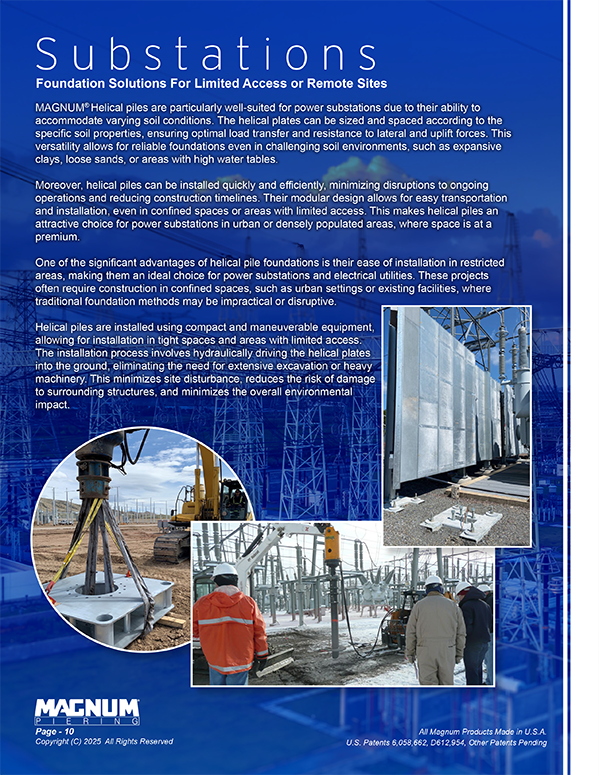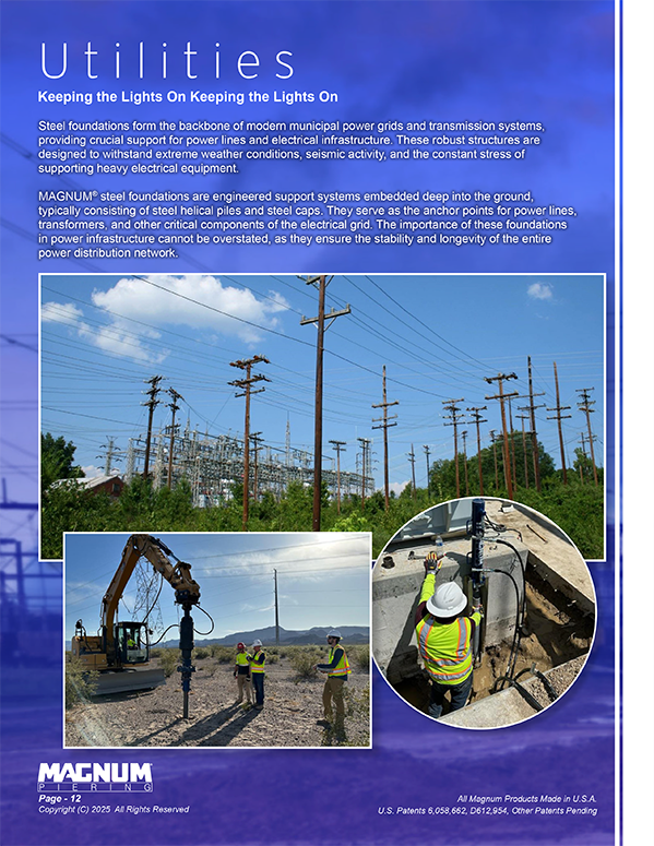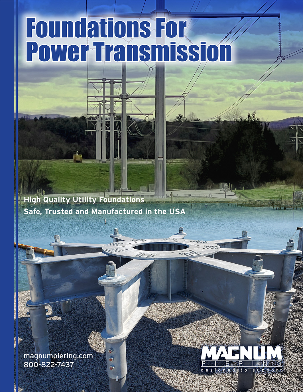 Foundations For Power Transmission brochure covers MAGNUM® Utility Grillage (MUG) systems. These unique foundation systems are used for power transmission and distribution services. These are manufactured in the USA according to our ISO 9001 approved Quality Program. Structural capacities are developed according to AISC 360 and NESC provision. The MUG is configured to fit any structure and ground line moment. It can be secured to helical piles, driven piles, drilled shaft, or micropiles. Your MUG system will be designed by our full-time staff of engineers to coordinate with your structure, pile type and site soils to ensure a high-quality foundation for your project. MUG foundation systems are available in many styles, sizes and capacities to fit the needs of your project. MUG are protected from the elements by hot-dip-galvanized, epoxy coating or a dual coat system.