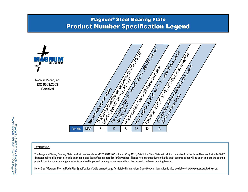 Steel Bearing Plate Product Number Specifications page, which shows how to read product numbers for steel bearing plate products