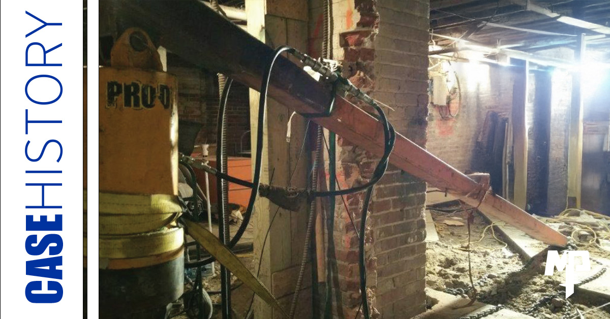 The historic structure offered limited access, with a doorway clearance of approximately three feet—far too restrictive for conventional helical pile installation equipment. Additionally, the installation location was fully enclosed, restricting maneuverability and placing strict limits on equipment size, orientation, and power delivery.