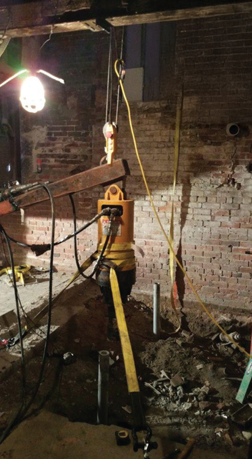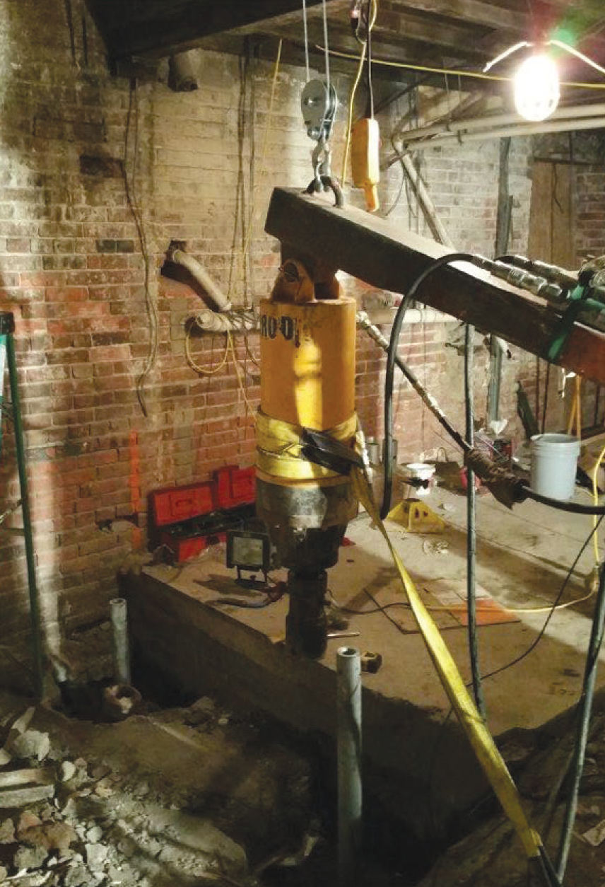MAGNUM Piering engineered a custom installation approach specifically for the site conditions. A custom rigging system was developed to allow the use of a 12,000 ft-lb hydraulic torque motor within the limited interior footprint.